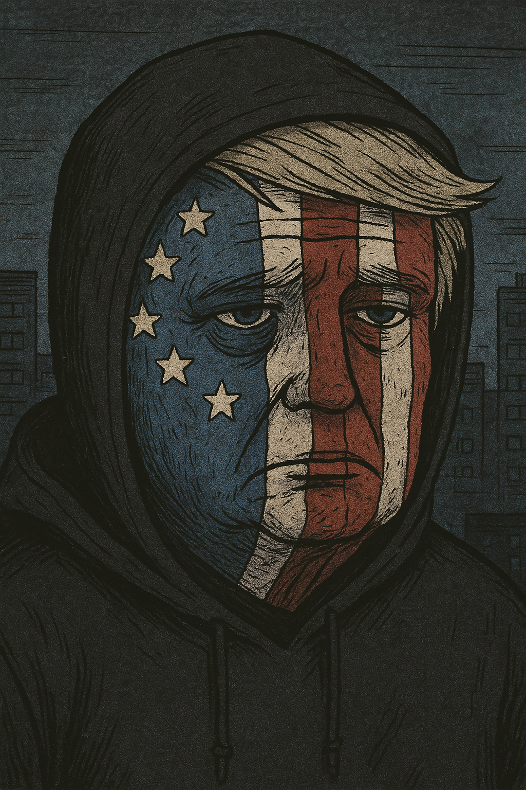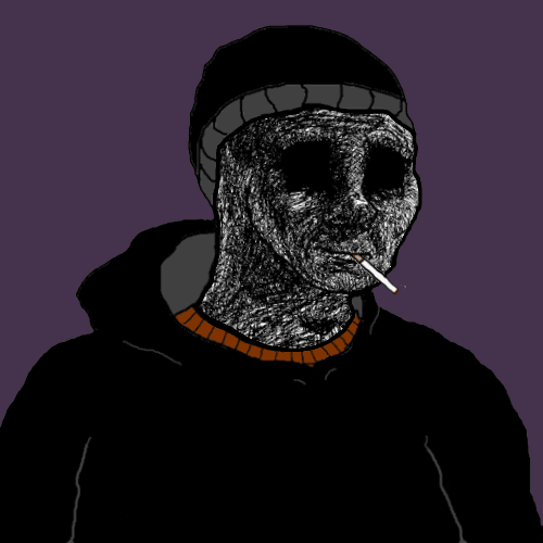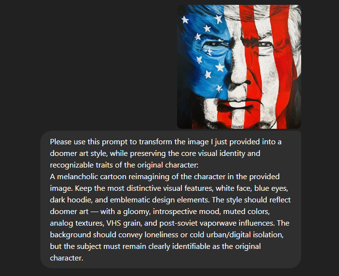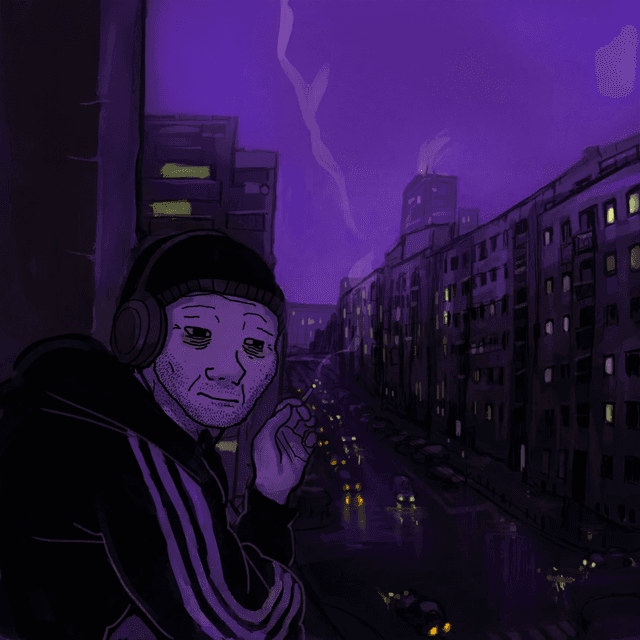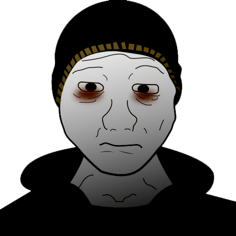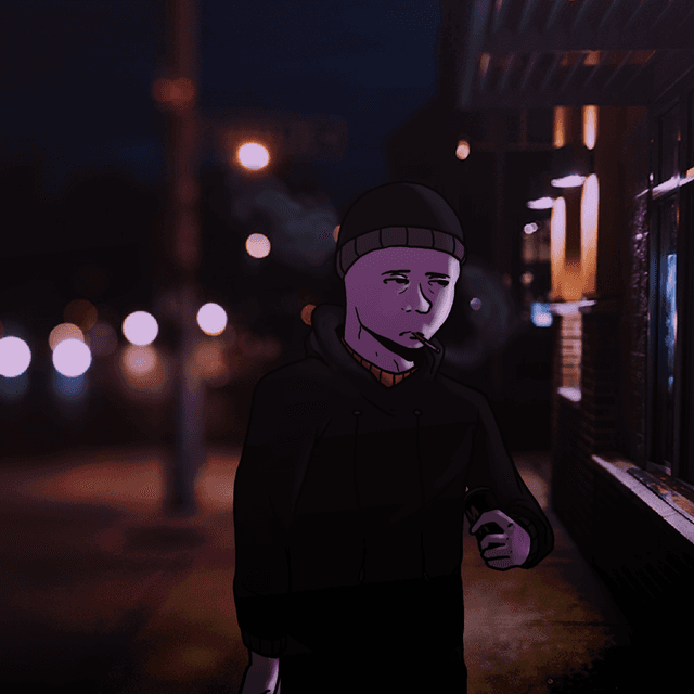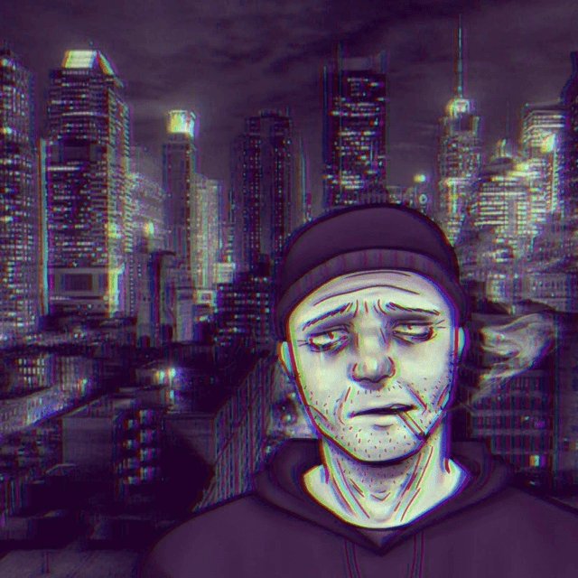 Please use this prompt to transform the image I just provided into a doomer art style, while preserving the core visual identity and recognizable traits of the original character: A melancholic cartoon reimagining of the character in the provided image. Keep the most distinctive visual features, white face, blue eyes, dark hoodie, and emblematic design elements. The style should reflect doomer art — with a gloomy, introspective mood, muted colors, analog textures, VHS grain, and post-soviet vaporwave influences. The background should convey loneliness or cold urban/digital isolation, but the subject must remain clearly identifiable as the original character.